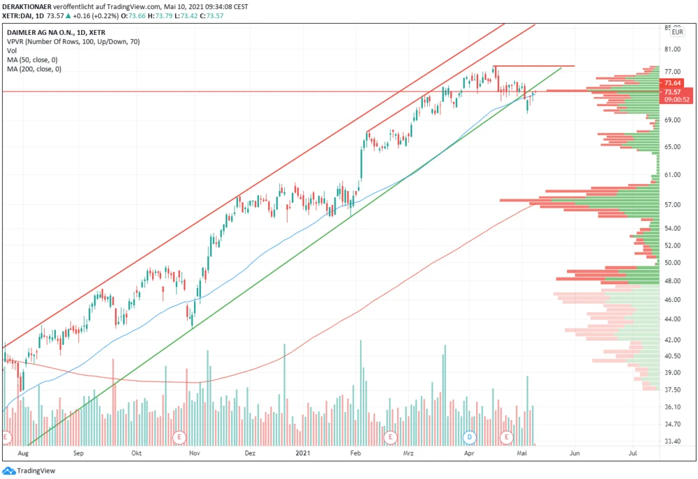 Der Autobauer Daimler hat aufregende Wochen hinter sich. Zuerst ist die Reaktion auf die Quartalszahlen vor drei Wochen recht verhalten ausgefallen. Dann haben große Aktienverkäufe von Nissan sowie Produktionsstopps wegen des Halbleitermangels die Aktie unter Druck gesetzt. Charttechnisch hat der Wert all das aber gut weggesteckt.
