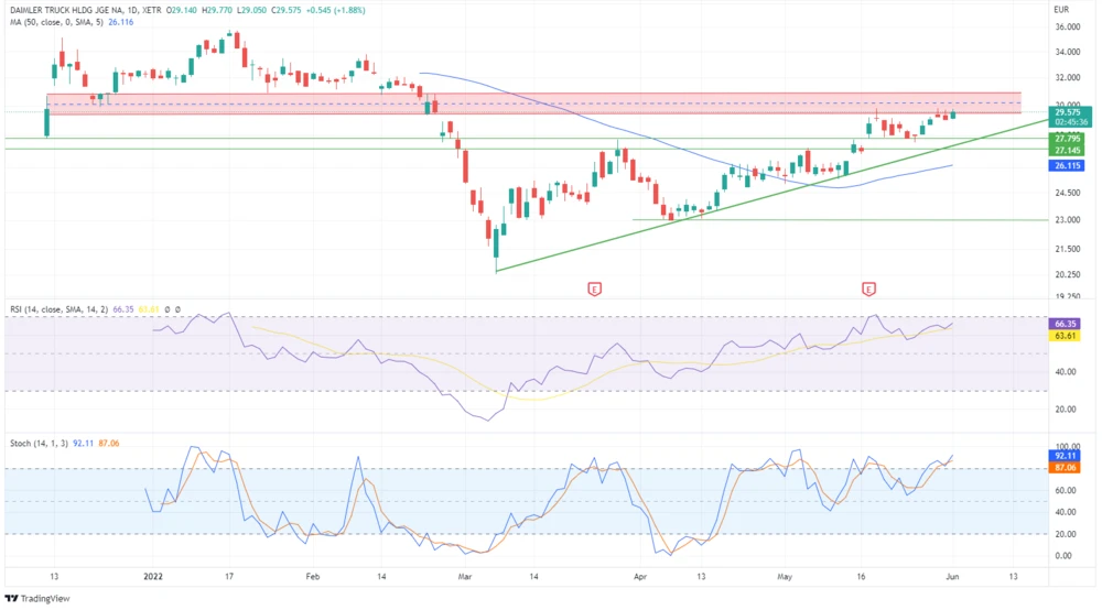 Nach dem Lauf der vergangenen Wochen stößt die Aktie von Daimler Truck nun auf die Widerstandszone zwischen 29,50 und 30,90 Euro. Diese spannt sich an den Verlaufstiefs auf, die der Kurs vor dem Ukraine-Krieg markiert hat.