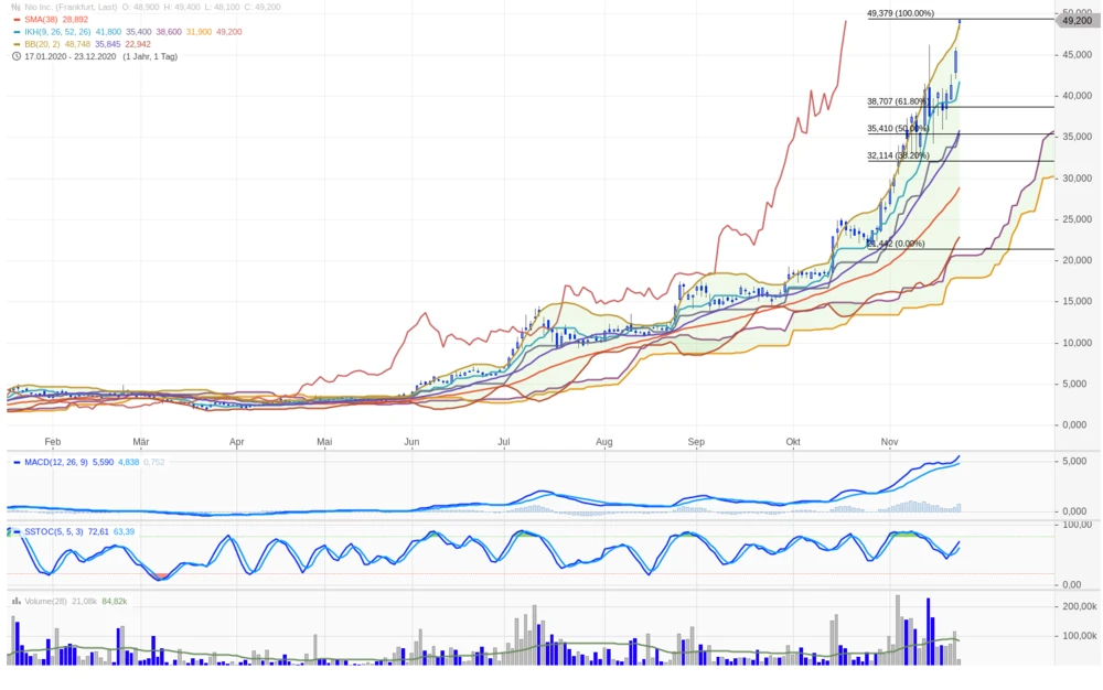 „Die Nio-Aktie kennt weiterhin kein Halten. „Mal wieder“ ein neues Alltime-High und dabei noch immer noch Potential nach oben. Sowohl die Kurzfristindikatoren als auch die Trendfolger zeugen von weiterem Kurssteigerungschancen. Eine Slow-Stochastik trotz Anstiegs im neutralen Terrain und ein MACD immer noch mit Luft nach oben. Zudem sich ein nach oben öffnendes Oberes Bollinger-Band. Auch dieser Aspekt spricht für bullische Trendstärke. Last not least wird diese auch durch den Ichimoku-Indikator weiterhin manifestiert. Zur Gewinnsicherung bieten sich die Fibonacci-Retracements an. Diese beginnen im Bereich 38,71 Euro“, sagt Charttechnik-Experte Martin Utschneider von Donner & Reuschel.