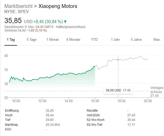 Die Aktie von Xpeng Motors ist am Donnerstag durch die Decke gegangen. Das Papier legte im Handelsverlauf um 30 Prozent zu. Auslöser des Kurssprungs war eine Kaufempfehlung der Bank of America.