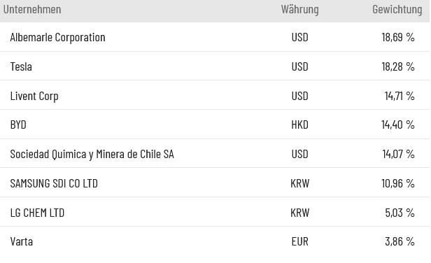 Damit dürfte auch auch die Nachfrage nach Batterien und den dafür benötigten Rohstoffen wie etwa Lithium stark ansteigen. Von diesen glänzenden Wachstumsperspektiven können Anleger mit einem Zertifikat auf den E-Mobilität Batterie Index profitieren. Der Index bildet mit seinen acht Unternehmen die gesamte Prozesskette der E-Mobilität ab. Das Papier des Lithium-Herstellers Albemarle ist dabei derzeit am höchsten gewichtet (siehe beigefügte Tabelle).