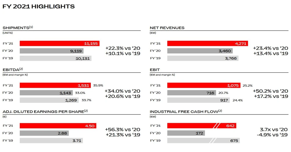 Im abgelaufenen Jahr lieferte Ferrari über 11 000 Autos aus, ein Plus von mehr als 22 Prozent. Die Umsätze stiegen noch einen Prozentpunkt stärker von knapp 3,5 auf knapp 4,3 Milliarden Euro. Das bereinigte operative Ergebnis konnte um 34 Prozent gesteigert werden. Damit erreichte der Autobauer sowohl bei den Erlösen als auch dem bereinigten operativen Gewinn seine selbstgesteckten Ziele. Unter dem Strich blieben mit 833 Millionen Euro 37 Prozent mehr Gewinn als 2020.