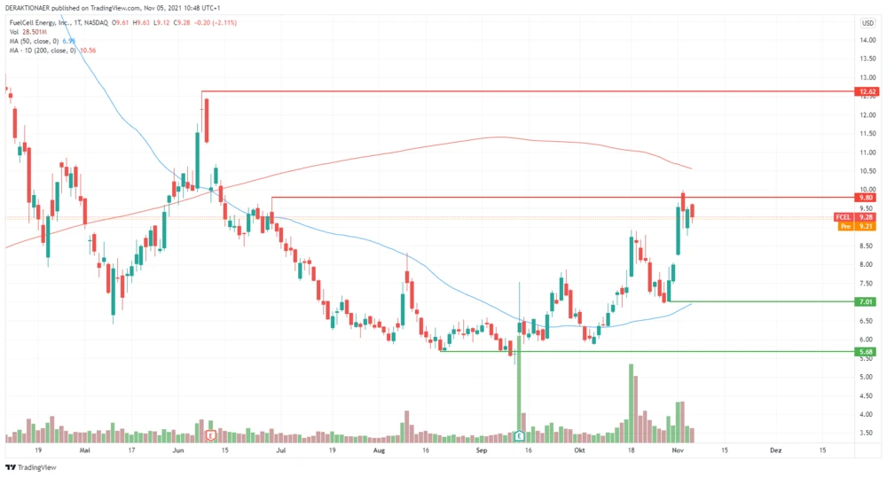 Im Juli ging der Abwärtstrend bei der FuelCell-Aktie in eine ausgedehnte Seitwärtsbewegung über. Der Titel testete bis Oktober mehrfach die Unterstützung rund um die psychologisch wichtigen 6-Dollar-Marke. Nun sind seit vier Wochen die Bullen zurück und die Papiere legte in dieser Zeit 70 Prozent zu. Der Kurs kletterte bis zur 10-Dollar-Marke.