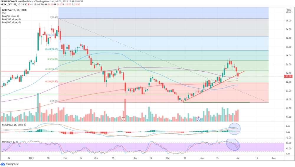 Seit Mitte Mai hatte sich die Geely-Aktie richtig gut gemacht. Der Wert hatte eine V-Formation ausgebildet, die er Mitte Juni erfolgreich nach oben bei 23,50 Hongkong-Dollar (HKD) auflöste. Der darauffolgende Ausbruch hielt jedoch nicht lange an. Denn in der vergangenen Woche prallte er am Widerstand am 50%-Fibonacci-Retracement bei 29,15 HKD ab und ging seitdem auf Talfahrt.