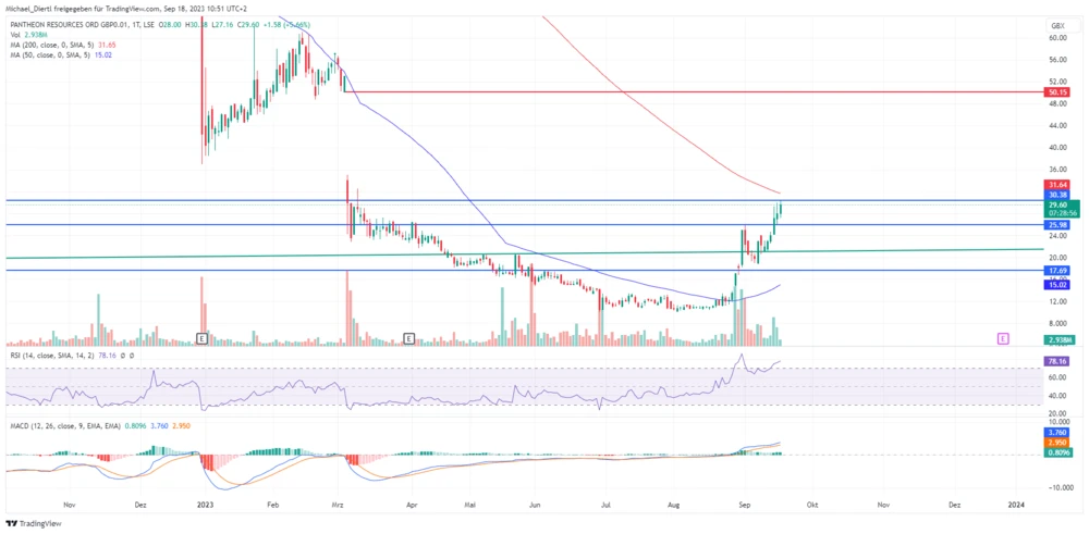 Bereits am Donnerstag, dem Tag nach der Kaufempfehlung, ging es für die Pantheon-Aktie zweistellig nach oben. Dadurch überwand sie das August-Hoch bei 25,98 Britische Pence, generierte ein Kaufsignal und markierte den höchsten Stand seit Mitte März.