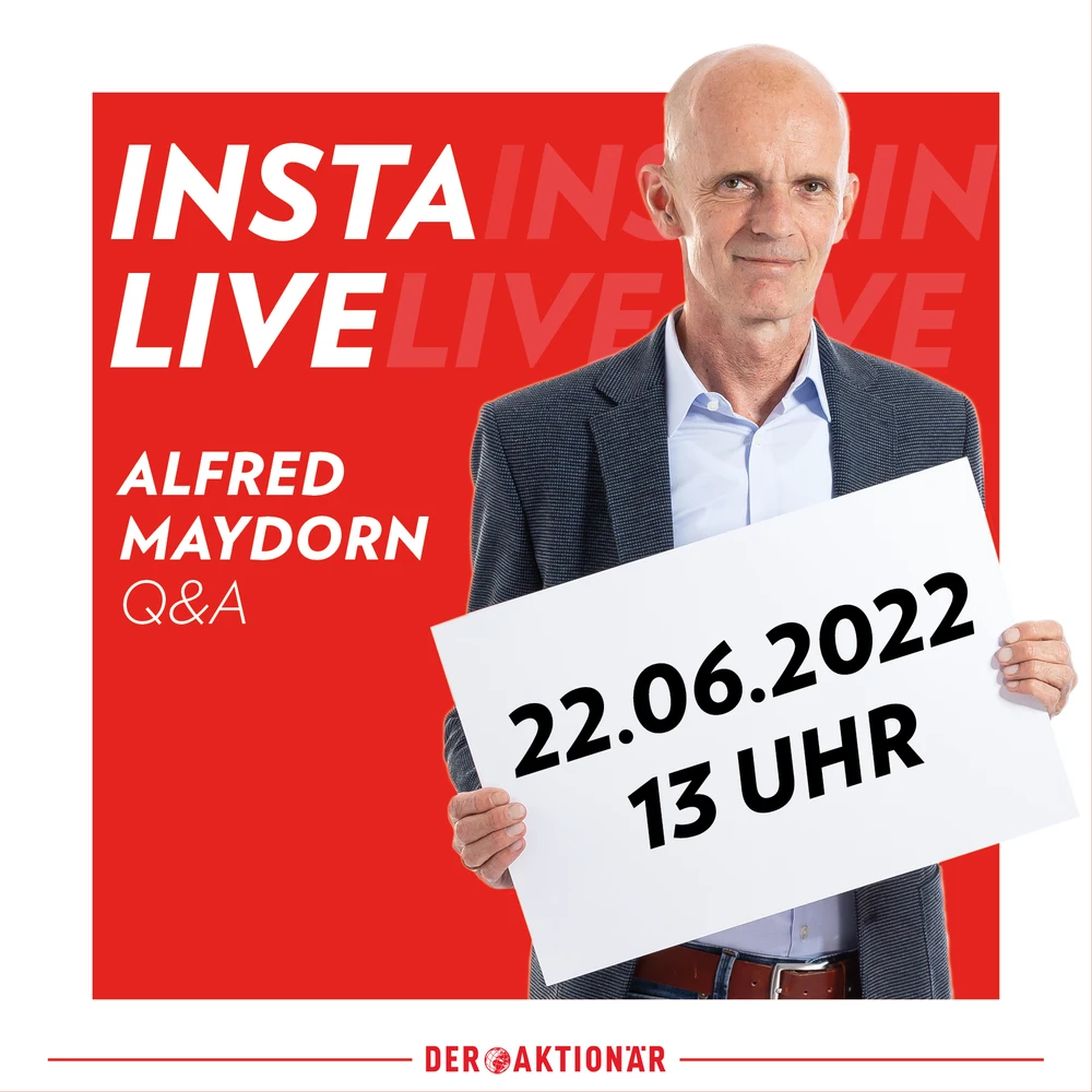 Alfred Maydorn ist seit über 20 Jahren Finanzjournalist und hat das Börsenmagazin DER AKTIONÄR mitentwickelt. Seine Tipps und Einschätzungen zu den Trends der Zukunft teilt er regelmäßig per kostenlosem Newsletter und auch im Video-Format „Maydorns Meinung“. Am 22.06. steht er Ihnen nun live Rede und Antwort. Ab 13 Uhr können Sie via Instagram Ihre Fragen an Alfred Maydorn stellen.