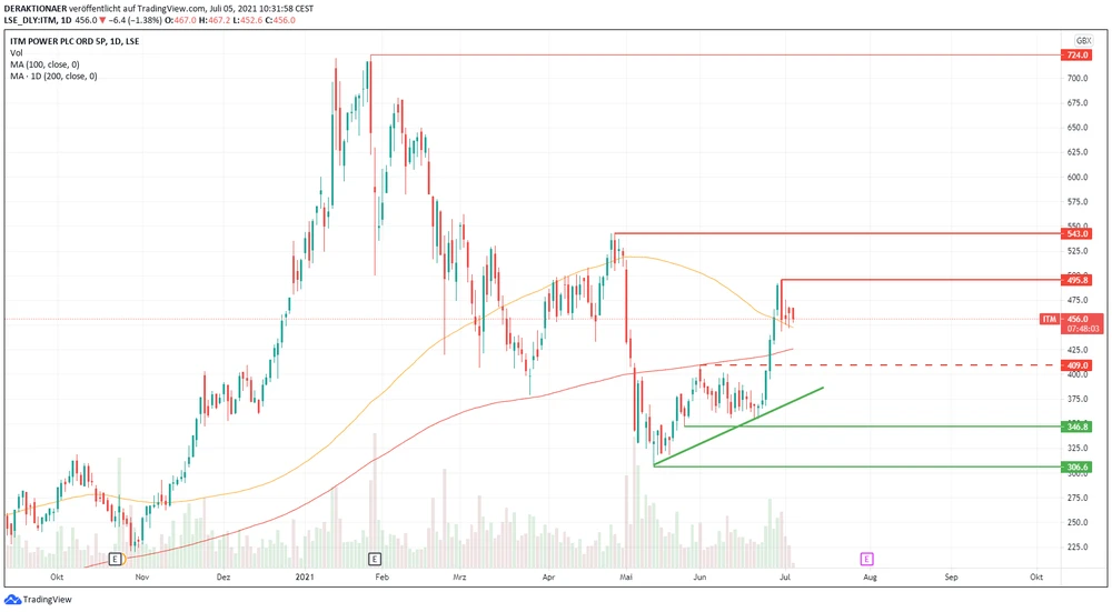 Am 25. Juni meistere die ITM-Power-Aktie den Ausbruch über den Widerstand bei 409 Britische Pence und generierte damit ein kurzfristiges technisches Kaufsignal. Der Kurs stieg im Anschluss bis auf 496 Pence. Bei der starken Aufwärtsbewegung wurden zwei weitere Widerstände überwunden. Der GD200 bei 426 Pence und der GD100 bei 447 Pence.