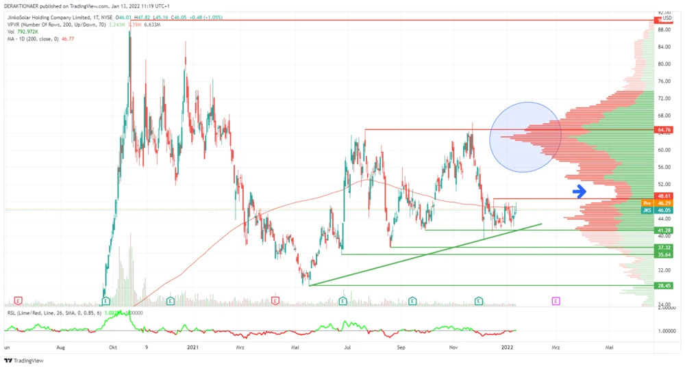 Noch gönnt sich die JinkoSolar-Aktie eine Verschnaufpause. Im Chart befinden sich allerdings einige Hinweise, dass ein Ausbruch bald gelingen könnte. Die Aussichten für das Unternehmen sind glänzend, aber aufgrund der hohen Volatilität ist der Titel nur für risikofreudige Anleger geeignet.
