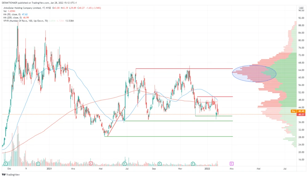 Mitte 2021 konnte der heftige Abverkauf bei der JinkoSolar-Aktie gestoppt werden. Es folgte zwischen Mai und Ende Juli ein Erholungsversuch, welcher jedoch am Volume-Peak bei 64 Dollar endete. Von dort aus konsolidiert der Wert bis heute in einer breiten Range, die sich am Verlaufstief bei rund 36 Dollar und dem eben genannten Peak bei 64 Dollar aufspannt.