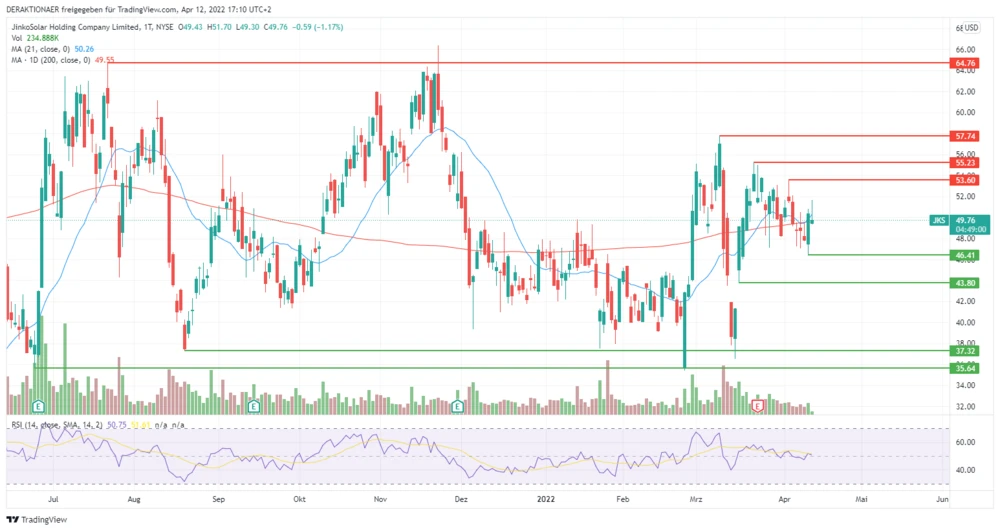 Die charttechnische Lage der JinkoSolar-Aktie ist aktuell noch durchwachsen, denn der Titel pendelt weiterhin um den GD200 bei rund 50 Dollar. Förderlich ist, dass die Volatilität wieder abgenommen hat, nachdem im März der Titel unter sehr hohen Schwankungen regelrecht Achterbahn gefahren ist.