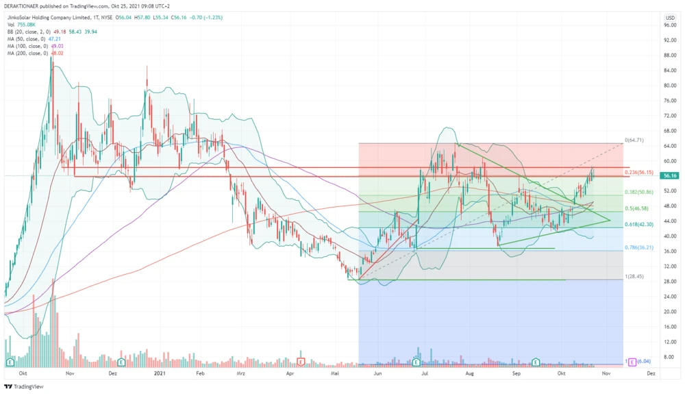 Die Aktie des Solarmodulherstellers JinkoSolar hat sich auch in der letzten Woche sehr gut entwickelt. Nachdem sie Anfang Oktober eine Dreiecksformation bei 48,60 Euro nach oben aufgelöst und dabei die 200-Tage-Linie überschritten hatte, löste sie ein starkes Kaufsignal aus. Daraufhin setzte der Titel zu einer starken Aufwärtsbewegung an.