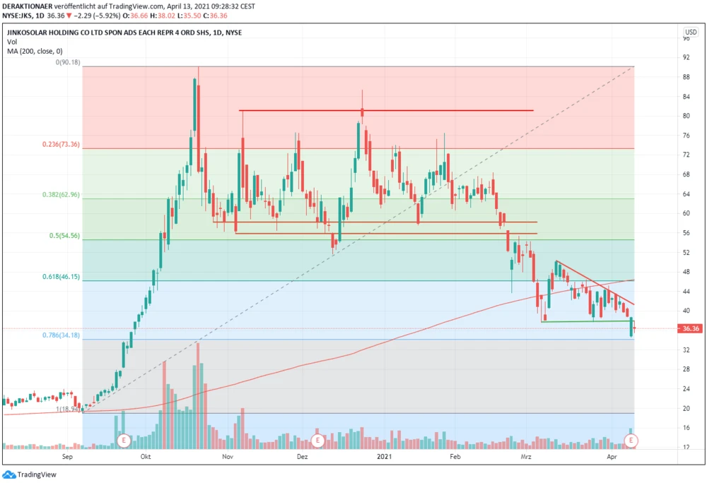 Nach der Veröffentlichung der Quartalszahlen am letzten Freitag öffnete die JinkoSolar-Aktie mit einem Abschlag von rund zehn Prozent nur knapp über dem 78,6%-Fibonacci-Retracement bei 34,18 Dollar (DER AKTIONÄR warnte). Dabei unterschritt der Kurs die untere Begrenzung einer Dreiecksformation, die er seit Anfang März ausgebildet hatte.