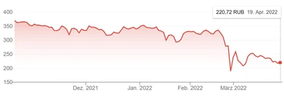 Die Gazprom-Aktie, die an westlichen Börsen weiterhin nicht handelbar ist, legte an der Börse Moskau heute um 1,7 Prozent auf 220,72 Rubel zu. Seit dem Zwischenhoch Anfang April bei 253 Rubel hat die Russen-Aktie jedoch um gut 12 Prozent nachgegeben. Seit Beginn der Sanktionen gegen Russland beträgt das Minus etwa 40 Prozent.