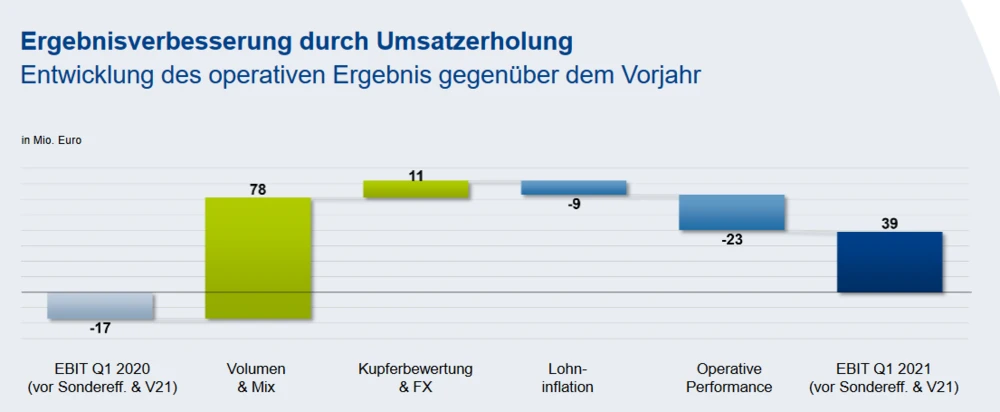 Zum Jahresstart konnte der Autozulieferer den Umsatz um rund ein Fünftel auf 1,35 Milliarden Euro steigern, das um Sondereffekte und Umbaukosten bereinigte Ergebnis vor Zinsen und Steuern (bereinigtes Ebit) lag bei plus 39 Millionen Euro, nach einem Minus von 17 Millionen Euro im Vorjahr.