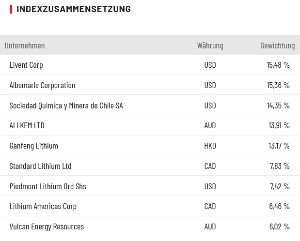 Mit dem Best of Lithium Index wird die gesamte Branche abgedeckt – von spannenden Explorations-Unternehmen wie Piedmont Lithium bis zu etablierten Produzenten wie Albemarle. Anleger, die das Schwankungsrisiko bei Lithium-Aktien auf mehrere Schultern verteilen möchten, setzen auf das Indexzertifikat WKN DA0AAS.