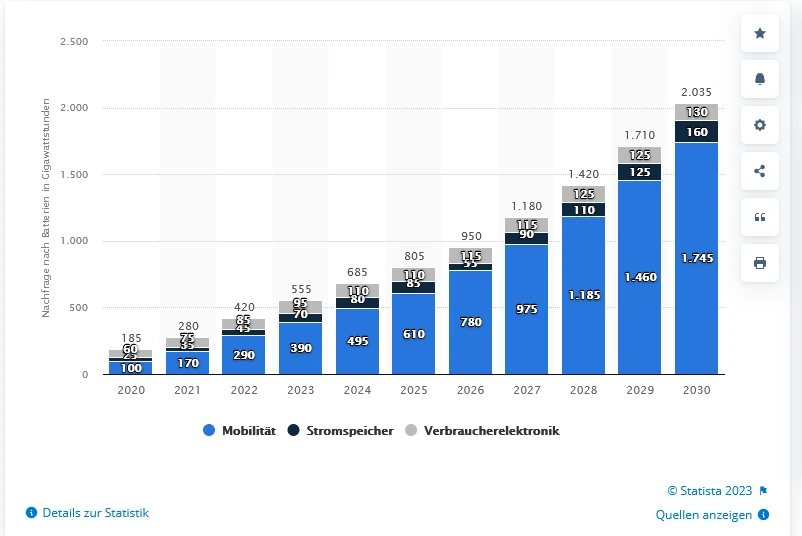 Laut Statista wird sich die Nachfrage nach Batterien knapp vervierfachen. Davon sollten die Indexmitglieder des Best of Lithium-Index profitieren. Mit der WKN DA0AAS können Anleger nahezu 1:1 an der Entwicklung des Index teilhaben.