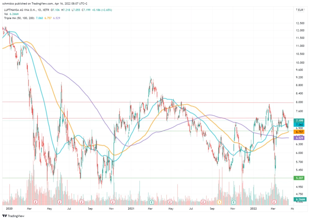Mit einem Minus von zeitweise über zehn Prozent waren es zwei unschöne Wochen für die Lufthansa-Aktie. In ihrer Abwärtsbewegung rutschte sie unter die 50-Tage-Linie an der 7-Euro-Marke. Am Mittwoch fiel der Kurs kurzzeitig sogar bis an die 100-Tage-Linie bei 6,75 Euro.