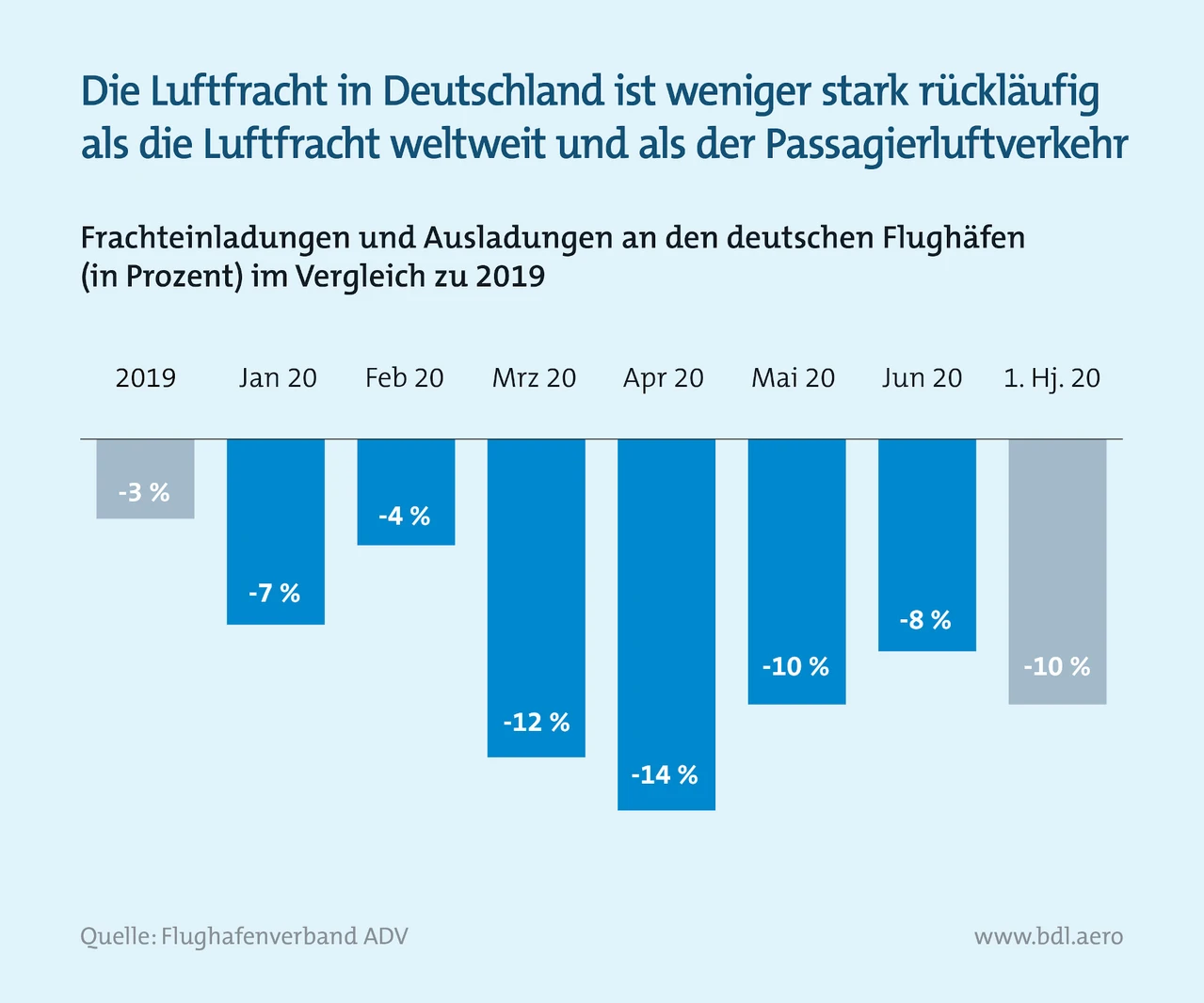 Insgesamt ist das Geschäft mit Luftfracht in Deutschland wegen der Corona-Pandemie zwar ebenfalls zurück gegangen, aber mit minus zehn Prozent deutlich weniger als im Passagier-Luftverkehr. Letzterer ist in Deutschland im ersten Halbjahr um 66 Prozent geschrumpft. Im Gesamtjahr dürfte das Luftfracht-Geschäft um etwa 15 Prozent zum Vorjahr zurückgehen.