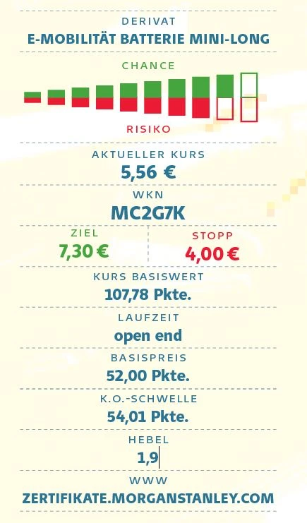 Wer auf den Durchbruch der Batterietechnologie setzt, hat je nach Risikoneigung verschiedene Produkte auf den Index zur Auswahl. Faktor-Zertifikate mit Faktoren von 1 bis 5 stehen unter www.zertifikate.morganstanley.com ebenso zur Verfügung wie Mini-Longs mit einem Hebel von 2,0 bis 8,0. Für Skeptiker gibt es sogar einen Mini-Short mit 2er-Hebel.
