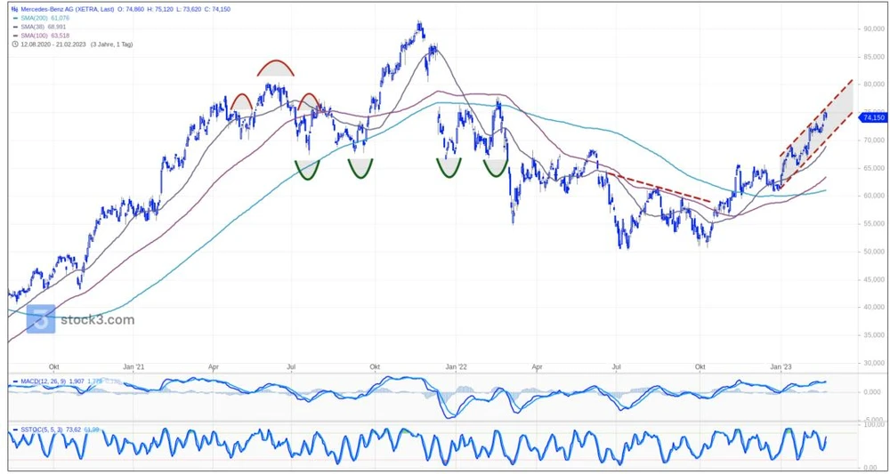 „Sollte die Mercedes-Aktie wirklich auf 71,33 Euro korrigieren, dann wäre besagter Aufwärtstrend davon nicht betroffen. Auch die weiteren markttechnischen Indikatoren deuten kurz- bis mittelfristig auf eine enge Bandbreite und verhältnismäßig geringe Ausschläge hin. Es gibt daher aktuell weder Grund zur überschnellen Kaufpanik, aber auch ebenso wenig zur voreiligen Verkaufspanik“, ergänzt Utschneider.