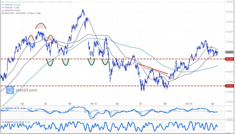 Aus charttechnischer Sicht befindet sich die Aktie zurzeit in einer kurzfristigen technischen Konsolidierungsphase. „Dadurch rückt auch die wichtige charttechnische Unterstützung bei 66,48 Euro wieder in den Fokus. Diese war in den Jahren 2021 und 2022 des Öfteren eine wichtige Supportlinie. Auch im Januar dieses Jahres hielt diese Marke zuletzt schon einem Re-Test stand. Gemäß der Bollinger-Band-Analyse dürfte sich aber die Volatilität der Mercedes-Aktien in Grenzen halten. Die Bandbreite erstreckt sich aktuell zwischen 72,02 Euro und 67,79 Euro. Der parallele Verlauf zeugt zudem von einer möglichen Seitwärtsbewegung in nächster Zeit. In dieses Horn „blasen“ auch die markttechnischen Indikatoren. Sowohl der Trendfolger MACD als auch die kurzfristige Slow-Stochastik zeigen sich neutral. Auch der Ichimoku-Indikator indiziert eine seitwärts ausgerichtete Entwicklung. Allerdings nur noch minimal. An der Volatilitätsbandbreite von 72,02 bis 67,79 Euro wird das zunächst nichts ändern“, sagt Charttechnik-Spezialist Martin Utschneider von Donner & Reuschel.