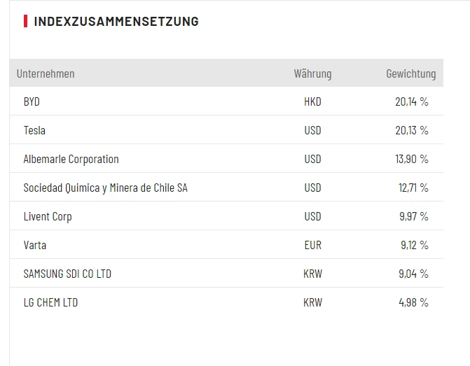 Damit wird auch die Nachfrage nach Batterien und den dafür benötigten Rohstoffen wie etwa Lithium perspektivisch stark ansteigen. Von diesen herausragenden Wachstumsperspektiven profitieren Anleger am besten, indem sie in den E-Mobilität Batterie Index investieren. Der handverlesene Aktienkorb enthält acht aussichtsreiche Unternehmen, die die gesamten E-Auto-Wertschöpfungskette abbilden – vom Rohstoff-Lieferanten wie etwa Livent bis zum chinesischen E-Autobauer wie BYD.