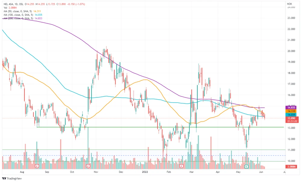 Ende Mai versuchte die Aktie von Nel den GD200 bei 14,84 Norwegischen Kronen (NOK) zu meistern, prallte aber an ihm ab. Nachdem der Kurs daraufhin auch unter den GD50 bei 14,54 NOK gerutscht war, erwies sich der GD100 bei 14,04 NOK zunächst noch als verlässliche Unterstützung.