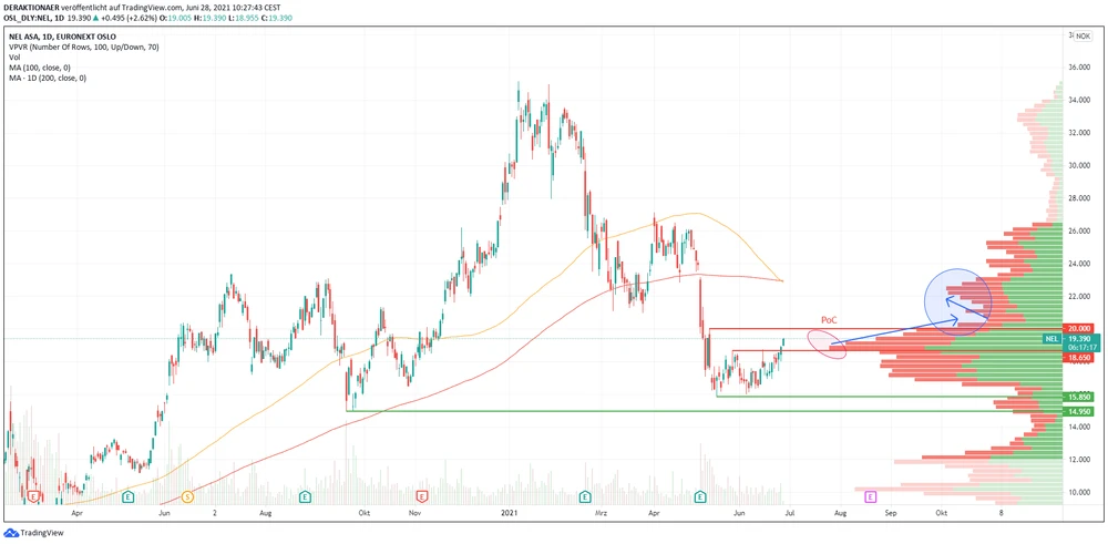 Knackt der Titel auch diese Marke, wird es erst richtig spannend. Oberhalb von 20 NOK fällt das Handelsvolumen stark ab (blauer Kreis im Chart). In solchen Preisbereichen kommt es häufig zu schnellen Bewegungen bis an das nächst höhere Volumen-Peak. Dieses liegt aktuell am GD200 bei rund 23 NOK.