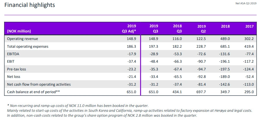 Nel hat die Zahlen zum dritten Quartal 2019 veröffentlicht. Sowohl beim Umsatz als auch EBITDA schnitten die Norweger besser ab als von Analysten prognostiziert. Der Auftragsbestand stieg um 58 Prozent im Vergleich zum Vorjahreszeitraum. Der Wasserstoff-Player Nel bestätigt den starken Marktausblick.