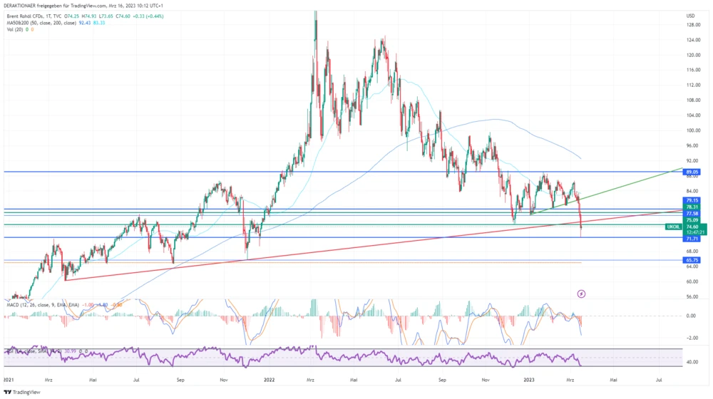 Aus technischer Sicht könnte es für Brent noch tiefer gehen. Fällt der Kurs unter das März-Tief bei 71,71 Dollar, sollte der Preis auch die 70-Dollar-Marke unterschreiten. Anschließend könnten sich im Bereich des Dezember-Tief aus 2021 bei 65,75 Dollar wieder Käufer finden.