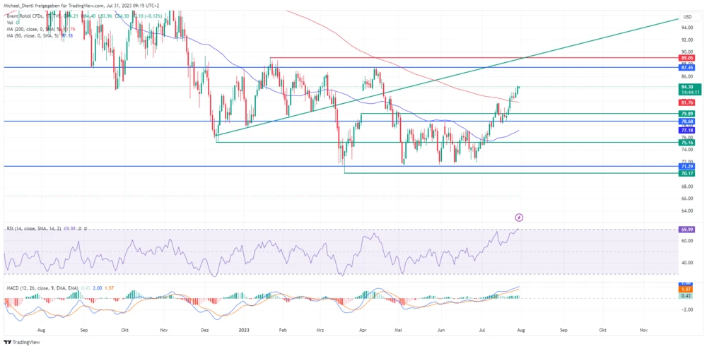 Aus technischer Sicht hat Brent mit der 200-Tage-Linie bei 81,76 Dollar die nächste wichtige Hürde hinter sich gelassen. Damit deutet alles darauf hin, dass im Bereich der 72-Dollar-Marke zumindest ein mittelfristiger Boden eingezogen und der Abwärtstrend vorerst beendet ist. Schaffen es die Bullen nun, sogar das April-Hoch bei 87,45 Dollar zu überwinden, stehen die Chancen für ein neues Jahreshoch gut.