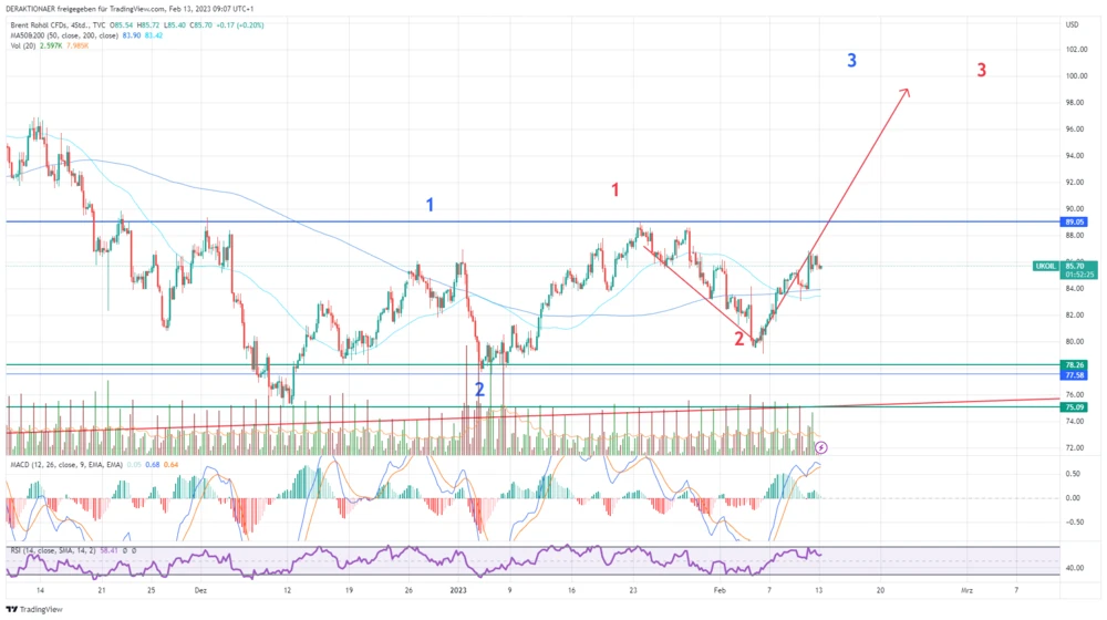 Idealerweise führen die Förderungskürzungen dazu, dass sich das Eins-Zwei-Setup auflöst. Dafür müsste der Preis für Brent-Öl zunächst über das Jahreshoch bei 89,05 Dollar ansteigen. Das dadurch entstehende Kaufsignal sollte dreistellige Kurse nach sich ziehen.
