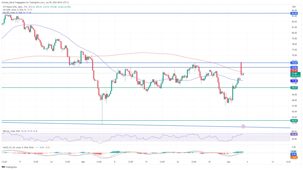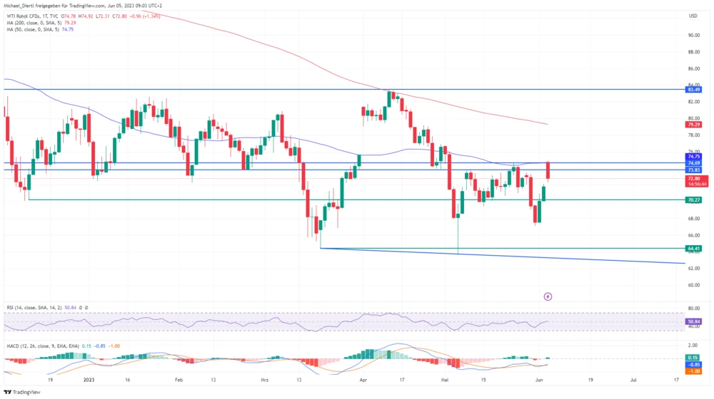 Nicht nur fundamental, sondern auch technisch betrachtet hat die Opec-Sitzung spürbaren Einfluss genommen. Denn schon in der Nacht sprang der Preis für Öl der US-Sorte WTI über das Mai-Hoch bei 74,69 Dollar und erzeugte dadurch ein Kaufsignal.