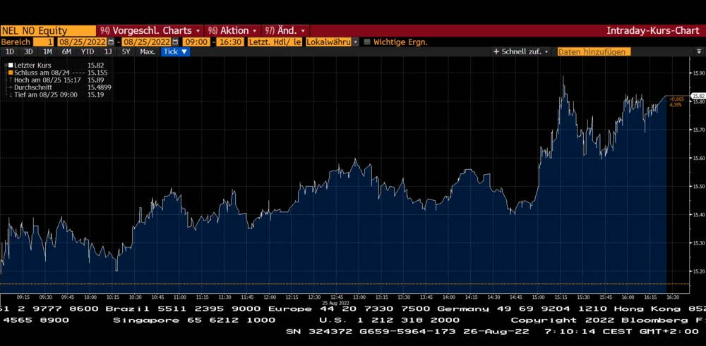 Auch bei der Aktie der norwegischen Nel konnte ab 15 Uhr am Donnerstag eine dynamische Kursbewegung nach oben beobachtet werden. Zum Handelsende in Oslo belief sich das Kursplus auf 4,4 Prozent.