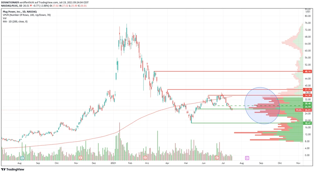 Positiv bleibt, dass das Volumen-Profil im Bereich zwischen 24 bis 30 Dollar ein Volumen-Peak ausgebildet hat und damit als Unterstützung fungiert. Hier wurden also entsprechend viele Transaktionen abgewickelt und der Markt beurteilt aktuell diese Preis-Range als fair (siehe Chart).