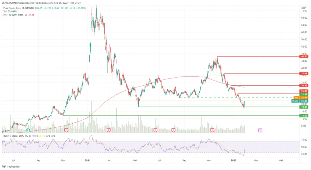 Im Verlauf der Korrektur fiel die Aktie von Plug Power am vergangenen Freitag bis auf 17,51 Dollar. Erste Schnäppchenjäger griffen bereits zu und so schaffte der Titel wieder den Sprung über die Unterstützung bei 18,47 Dollar.