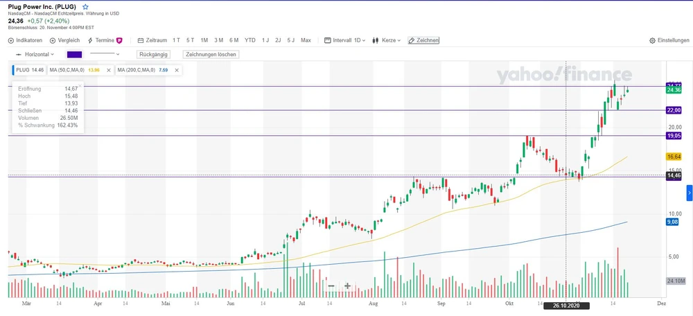 Für ein neues 52-Wochen-Hoch müssten die Papiere das bisherige Hoch bei 25,49 Dollar überwinden. Glückt der Sprung darüber, würde Plug Power ein frisches Kaufsignal generieren und damit seinen steilen Trend der letzten Tage fortsetzen.