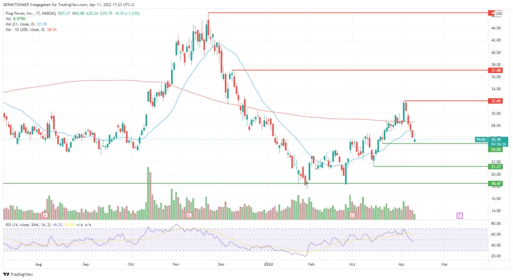 Anfang März kämpfte die Plug-Power-Aktie noch mit der massiven Unterstützung im Bereich der 18,50 Dollar Marke. Dann sendeten die Bullen ein starkes Zeichen und setzten zur Erholung an. Der Titel erreichte am 4. April ein Mehrmonatshoch bei 32 Dollar. Dieser Tag sticht besonders heraus, da der Kurszuwachs von zwölf Prozent ungewöhnlich hoch war.