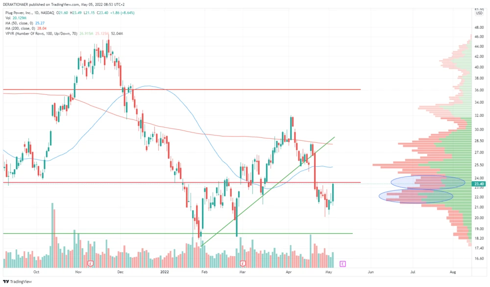 Anfang April fand die Erholungsbewegung bei der Plug-Power-Aktie ein Ende. Ausgehend vom Hoch bei 32,05 Dollar verlor der Titel innerhalb von rund vier Wochen in der Spitze 37 Prozent an Wert. Nachdem sich der Abverkauf Anfang der Woche am unteren Ende eines stark gehandelten Preisbereichs (zwischen 20,50 und 23,00 Dollar) stabilisierte, brach der Kurs am Mittwochabend infolge des Zinsentscheids nach oben aus.