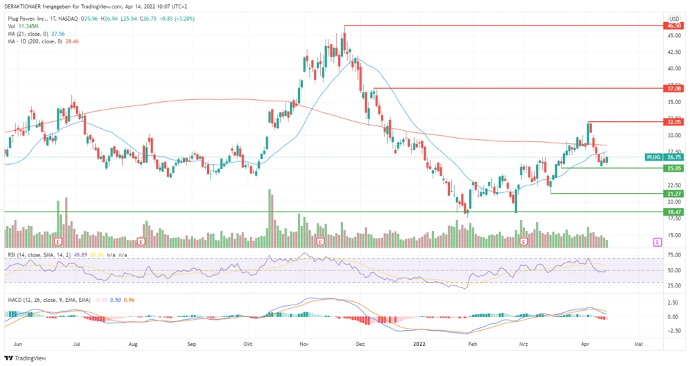 Die Plug-Power-Aktie erreichte am 4. April ein Mehrmonatshoch bei 32 Dollar. Ausgehend vom Tief Ende Februar bei 18,50 Dollar entspricht dies einem Kurszuwachs von 73 Prozent. Aufgrund dieser Relation ist die aktuelle Korrektur mit rund 20 Prozent angemessen und nicht besorgniserregend.