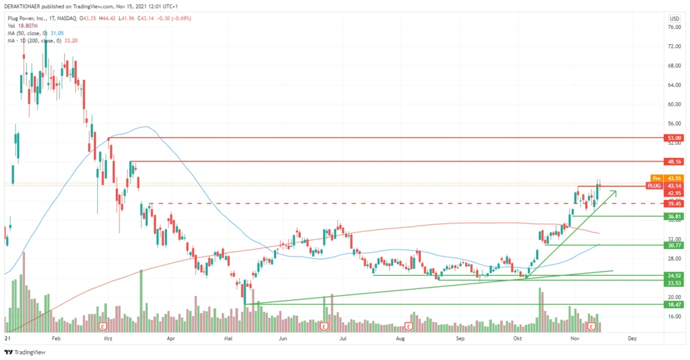 Die Plug-Power-Aktie ist weiter im Rally-Modus und wird auch zum Wochenstart vorbörslich mit einem leichten Aufschlag taxiert. Auch der Gap-Close aus dem März 2021 ist ein positives Zeichen, dass die Aufwärtsdynamik anhalten dürfte. Als nächstes Etappenziel steht der Widerstand bei 48 Dollar im Fokus der Bullen. Die psychologisch wichtige 40-Dollar-Marke stützt die Rally von unten. Investierte Anleger lassen die Gewinne laufen.