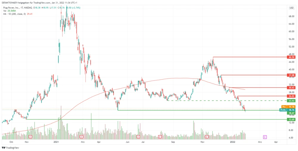 Die Korrektur bei der Plug-Power-Aktie hat sich in den vergangenen Wochen immer weiter ausgedehnt und inzwischen hat der Titel vom Mehrmonatshoch im November bei 46,50 Dollar rund 60 Prozent an Wert verloren. Mehrere Erholungsversuche scheiterten bisher. Auch die wichtige 200-Tage-Linie bei knapp 30 Dollar konnte den Kursverfall nicht stoppen.