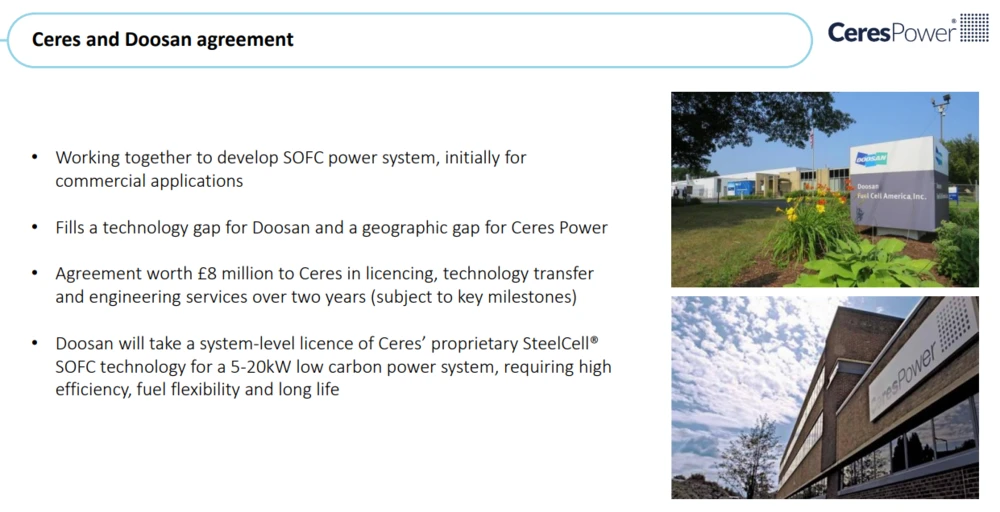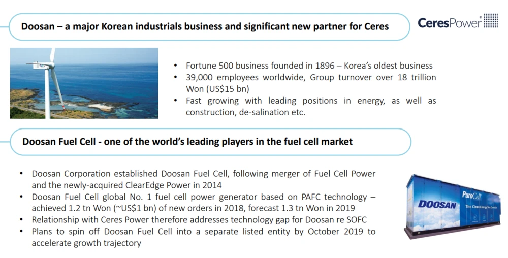 Doosan ist einer führenden Player im globalen Brennstoffzellen-Markt. Das Unternehmen sollten Investoren auf der Rechnung haben. Im Oktober 2019 planen die Koreaner einen Börsengang der Brennstoffzellen-Sparte. Ceres Power hat für den zukunftsträchtigen koreanischen Markt de facto einen Top-Player an der Seite.