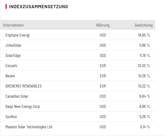 Solar-Energie spielt auf dem Weg zur Klimaneutralität ein gewichtige Rolle – gerade weil das Tempo bei der Energiewende zusehends zum global alles entscheidenden Faktor wird. Wer das Risiko einer (volatilen) Einzelaktie scheut, aber dennoch investieren will, greift idealerweise beim Solar Top 10 Index zu. Mit dem Indexzertifikat (WKN DA0AAV) kann der Anleger nahezu eins zu eins von diesem Milliarden-Markt und Mega-Trend profitieren. Weitere Details zum Index inklusive Produktübersicht. finden Sie hier.