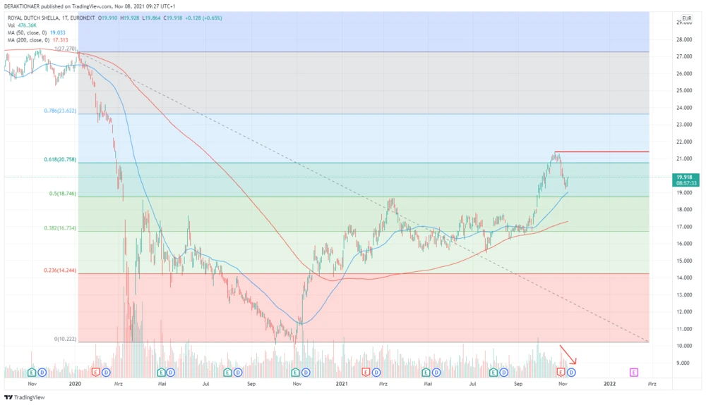 Das bisherige Jahr verlief für die Shell-Aktie eher unspektakulär. Sie konsolidierte in einer breiten Range zwischen 14,00 und 18,70 Euro. Erst im Zuge des anziehenden Ölpreises setzte der Titel zum Höhenflug an und brach Ende September über die Range aus. Innerhalb eines Monats legte der Wert um insgesamt 27,8 Prozent zu und markierte ein Verlaufshoch bei 21,38 Euro.