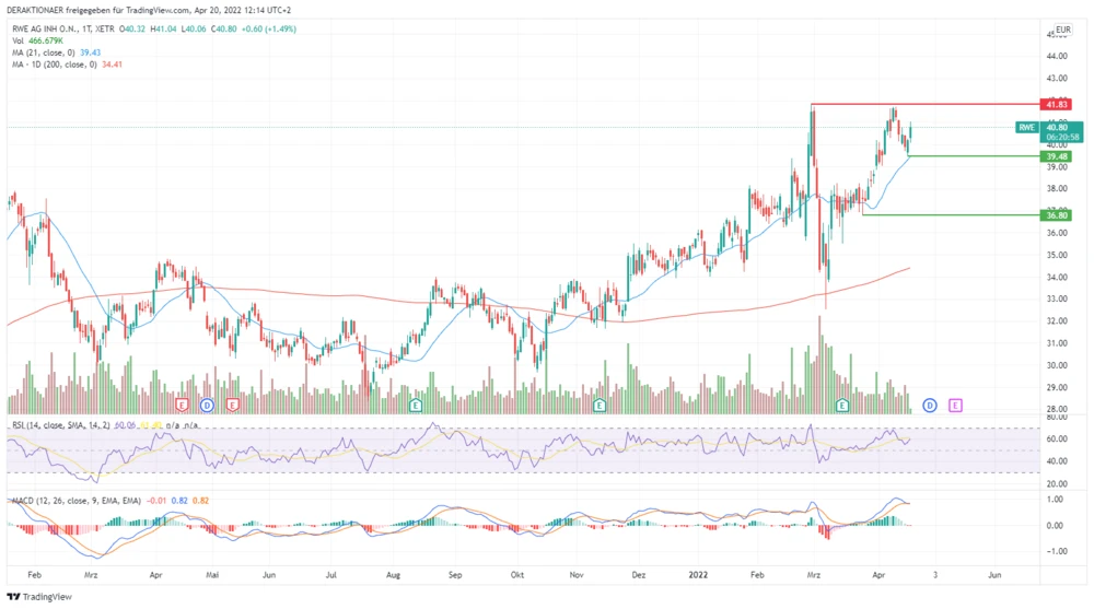 Aus technischer Sicht setzt die RWE-Aktie ihre Rally fort. Aktuell notiert der Kurs so hoch wie zuletzt im Sommer 2011 und der Aufwärtstrend ist weiterhin in gesunder Verfassung. Als nächste Hürde für die Bullen steht der Widerstand bei rund 42 Euro im Fokus. Wird diese Marke überschritten, wird ein neues Kaufsignal ausgelöst und weitere Dynamik sollte entstehen. Gestützt wird die Rally vom Support am GD21 sowie der psychologisch wichtigen 40-Euro-Marke.