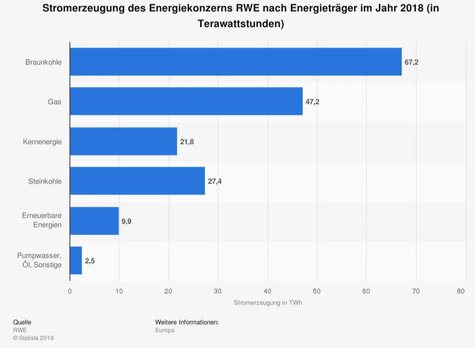 Braunkohle ist weiterhin der wichtigste Energieträger für die Stromerzeugung von RWE. Da aber die Preise für CO2-Emissionsrechte stark gestiegen sind, rechnet sich die Stromgewinnung durch Braunkohle immer weniger. Hinzukommen die gesunkenen Preise an den Strombörsen. RWE könnte daher auf einen schnelleren Kohleausstieg drängen, um Entschädigungszahlungen für das Abschalten der Kraftwerke vorzeitig zu erhalten.