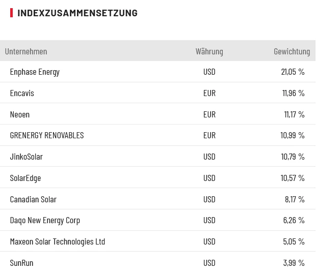 Die weltweit ambitionierten Ziele zur Klimaneutralität von Wirtschaft und Politk sind nur erreichbar, wenn die grünen Energien massiv ausgebaut werden. Insbesondere die Solar-Energie wird dabei eine entscheidende Rolle spielen. Hiervon sollten die Unternehmen aus dem Solar Top 10 Index profitieren. Anleger, die das Risiko einer Einzelaktie nicht eingehen wollen und das Risiko auf mehrere Schultern verteilen wollen, setzen auf das Indexzertifikat mit der WKN DA0AAV.