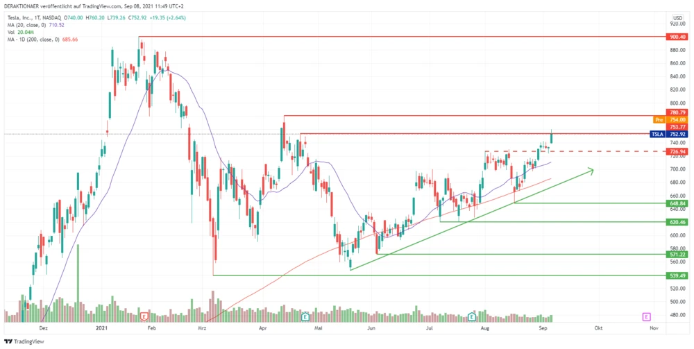 Aktuell präsentiert sich die Aktie von Tesla mit Relativer Stärke zum Gesamtmarkt. Am gestrigen Dienstag notierten die US-Indizes Dow Jones und S&P 500 bis zu einem Prozent schwächer, aber die Papiere des E-Autobauers konnten um 2,6 Prozent zulegen. Damit notiert der Titel nun an einem wichtigen Widerstand bei 753 Dollar. Ein starkes Zeichen, dass die Bullen weiter das Steuer fest in der Hand halten.