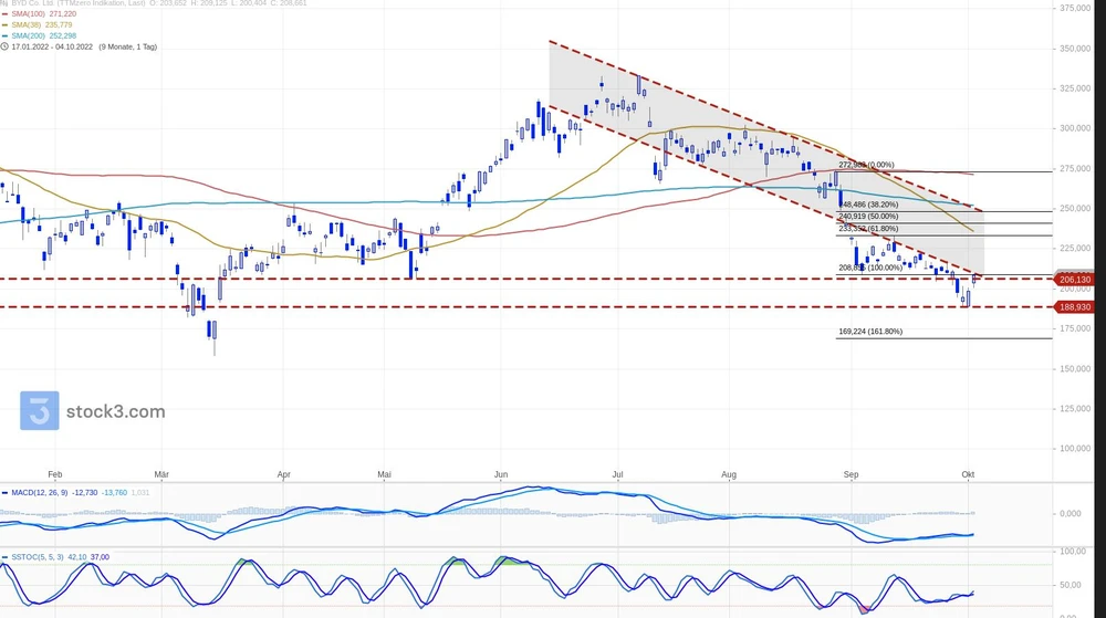 Die Reaktion auf die guten Zahlen von BYD steht noch aus. Die Börse in Hongkong hatte am Dienstag aufgrund eines Feiertages geschlossen. Aus technischer Sicht ist der seit dem 06.07.2022 eingeschlagene Abwärtstrend allerdings noch intakt.